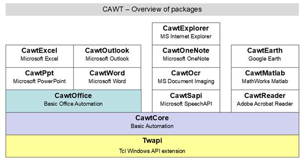 CAWT is a high-level Tcl interface for scripting Microsoft Windows® applications having a COM interface. It uses Twapi for automation via the COM interface.